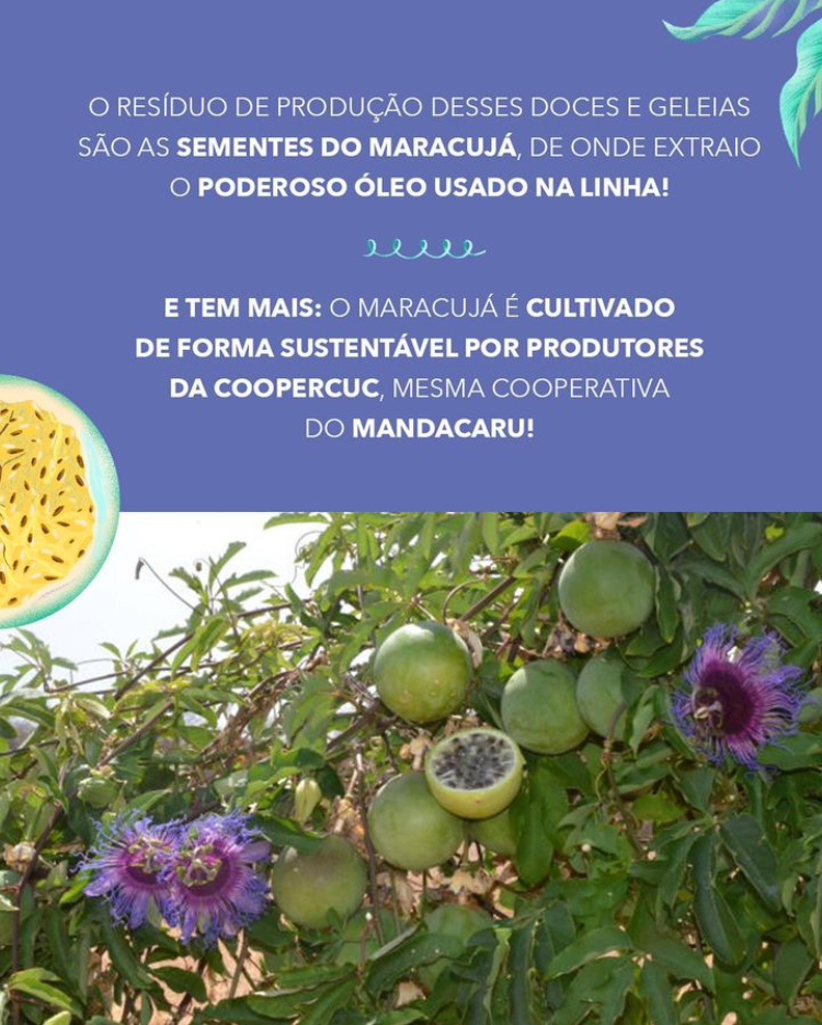 Com o Óleo de Maracujá da Caatinga enriquecido com ômega-9, ele é capaz de alinhar e selar as cutículas do cabelo, diminuindo pontas duplas, além de manter os cachos definidos por até 48 horas.